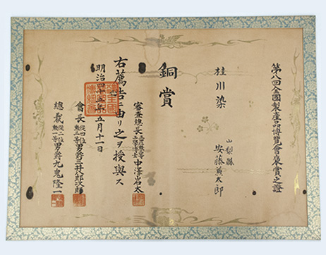 明治十二年、甲斐の猿橋にほど近い山梨県大月市富浜町宮谷を流れる桂川の水を使い初代安藤兼太郎は「桂川染」という技法で黒染め専門の安藤孝染工場の前身となる安藤染工場を設立。その技術は品評会で表彰されるなど大変品質が良いため安藤の黒染めで「安黒」と呼ばれ、その名前は日本橋の問屋街で親しまれた。