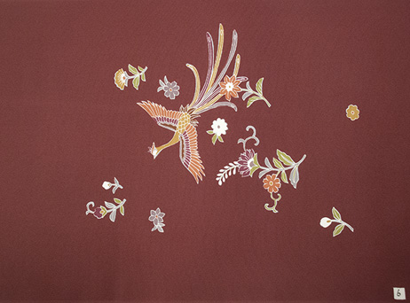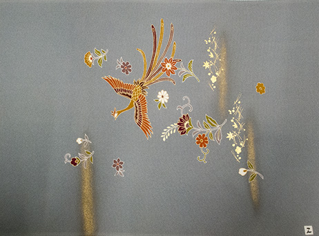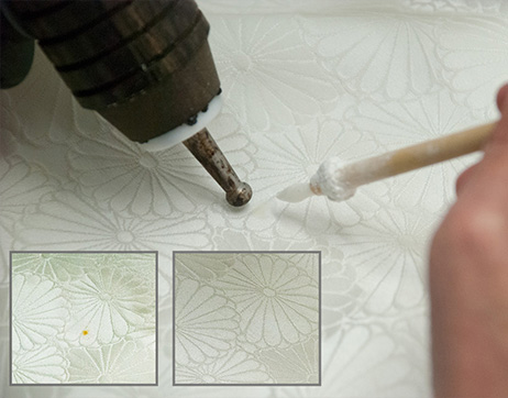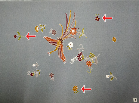金彩加工と同様にシミ抜きできないものに上から元柄を参考に新たに柄を描きシミを隠します。