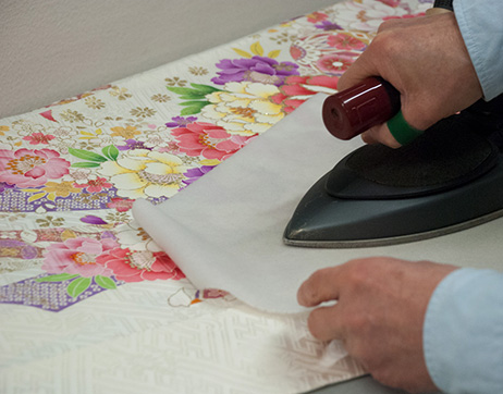 専用の蒸気アイロンと、余分な蒸気を吸い込むアイロン台で着物のしわを伸ばします。アイロンは着物の部位により、蒸気で仕上げる部分とアイロンを当てる部分を分けることで、よりきれいな仕上がりとなります。