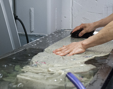 生洗いでは取れないシミや、部分的についたシミを専門の職人が念入りに落とします。シミは放置しておくと、黄変化(シミではなく生地自体の色が変化してしまうこと)して落としにくくなります。