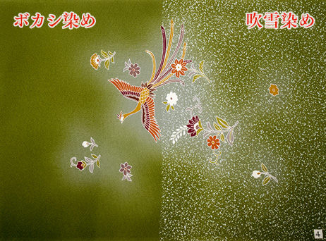 生地の全体にシミがある際や地色を替える際に用います。元柄を生かすために糊で柄を縁取るように伏せて染まらないようにし、上から地色より濃い色を掛けます。染め上がったら抜染剤を叩きつけるよう撒くとその箇所が吹雪のように薄くなります。