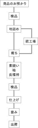 出荷 海外出荷前に国内スタッフが検品し出荷します。 検品 柄合わせなどは現地と国内工場でメールにて引き合いをさせていただきます。 地詰め 大型の地詰め機を使い、手熨しとの併用で丹念に行います。 紋工場 喪服、留袖は紋入れと付け下げ、訪問着などは縫い紋を入れます。 裁ち 日本人アドバイザーと協議し慎重に行います。 素縫い・袖・長襦袢 20年以上の和裁経験があるアシスタントが入念にチェックし次の工程に廻します。